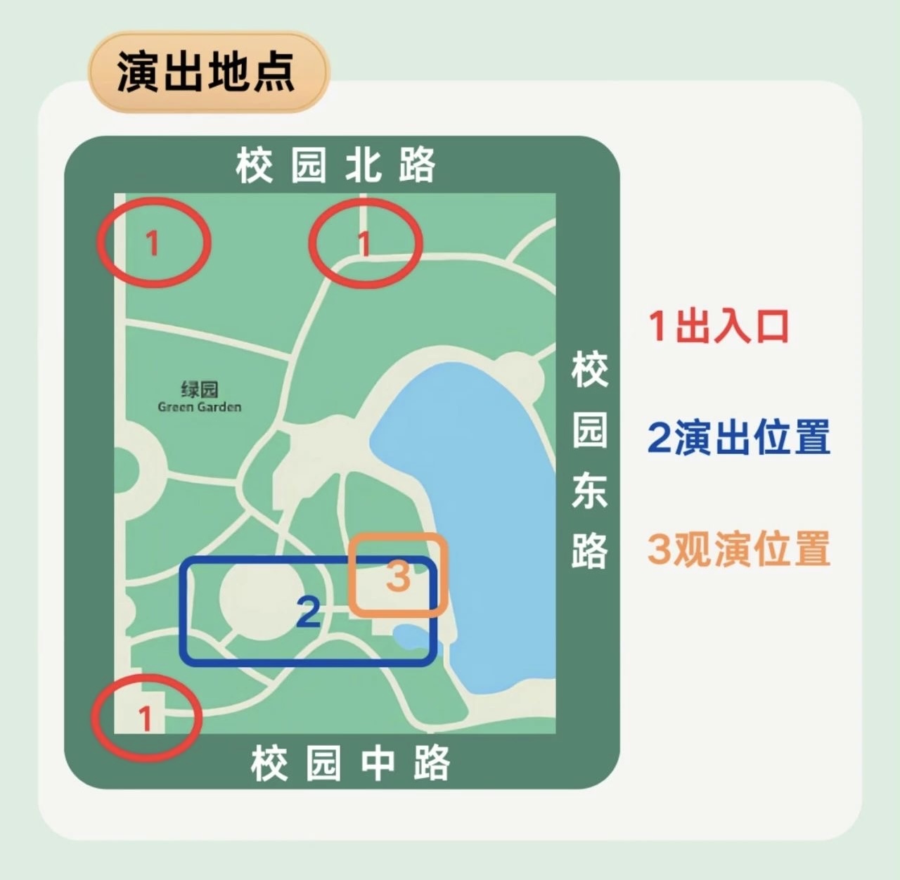 觀演入口為綠園北門、南門,請各位觀眾朋友們有序進場,道路較窄,請務(wù)必保證安全。