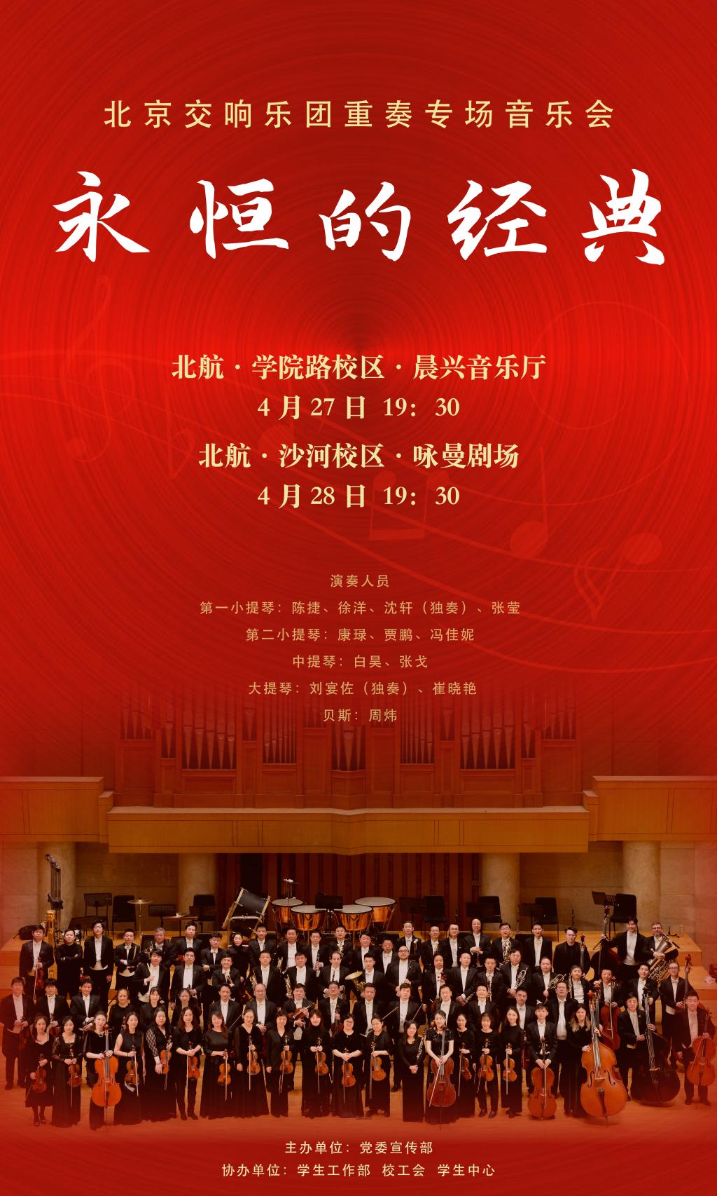 “永恒的經(jīng)典”——北京交響樂團(tuán)重奏專場音樂會將于周四(4月27日)19:30,周五(4月28日)19:30先后在學(xué)院路校區(qū)晨興音樂廳、沙河校區(qū)詠曼劇場上演。