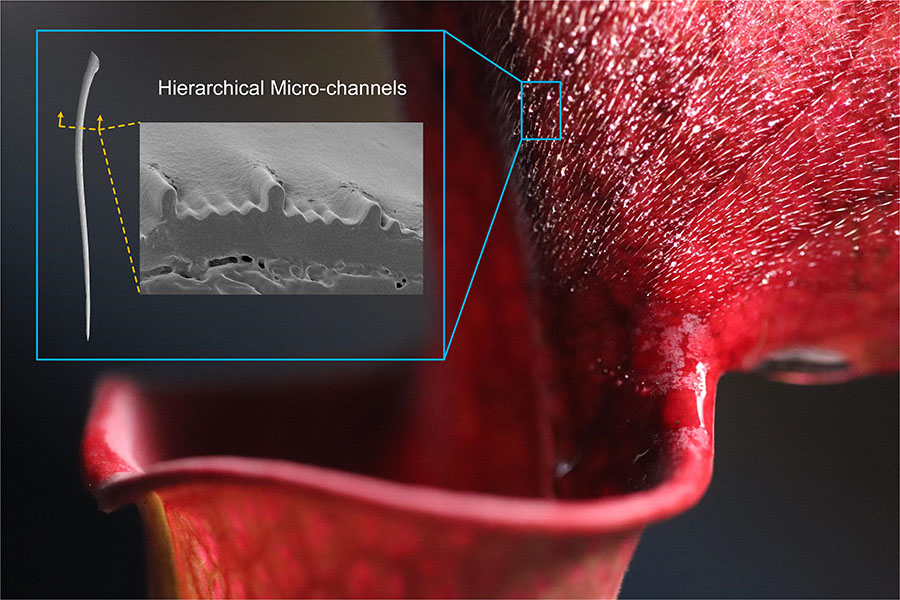 在對(duì)瓶子草表面微結(jié)構(gòu)的觀察基礎(chǔ)上,團(tuán)隊(duì)深入分析了絨毛的表面微觀結(jié)構(gòu)特征,首次發(fā)現(xiàn)了特殊的高低棱多級(jí)微納溝槽結(jié)構(gòu),液體也在表面干濕狀態(tài)下會(huì)相繼出現(xiàn)兩種不同的輸送模式。這種特殊高低棱多級(jí)溝槽結(jié)構(gòu)導(dǎo)致的兩種連續(xù)而又不一樣的輸水模式會(huì)首先在矮棱構(gòu)成的底部溝槽中快速形成一薄層水膜,后續(xù)液滴就可在這層水膜上超快速滑動(dòng),輸送模式在干、濕狀態(tài)下會(huì)發(fā)生明顯轉(zhuǎn)變。用陳教授的話來說,“有一種‘后浪推前浪’的效果”。