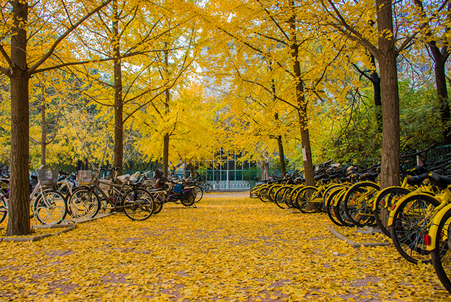 踩上小黃車,享受著穿梭在銀杏樹里那份急速馳騁的自由。